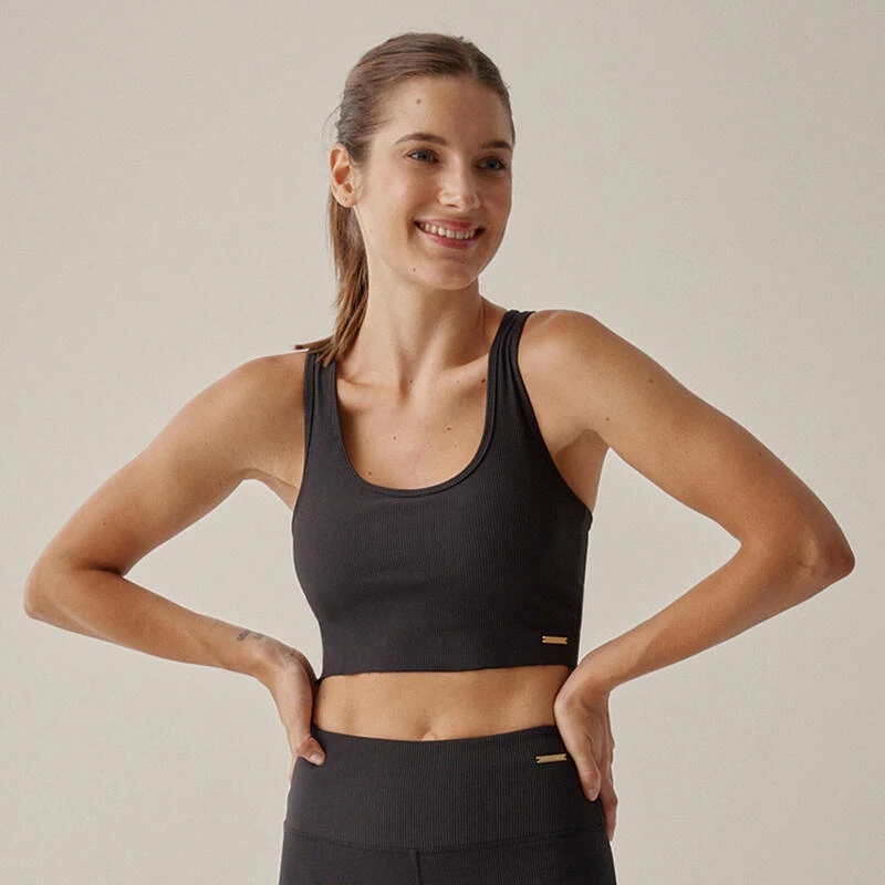 Compra en Decathlon Top deportivo Jari Sujecion media de mujer Black Limba Top deportivo crop top de canalé. Sujetador incorporado y relleno ligero extraíble. Espalda nadadora. Detalle de volante. Mínimo de costuras. Para entrenamientos de bajo y medio impacto.