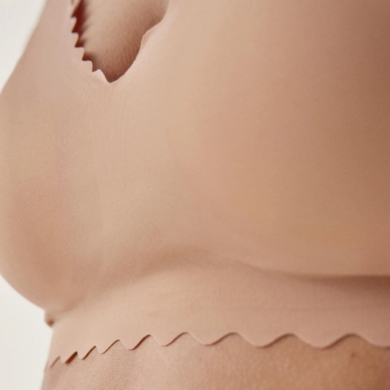 Compra en Decathlon Top deportivo Sujetador Vinca de mujer Black Limba Tan sin aro Sujetador tipo top sin aro de microfibra sin costuras, cortado a láser y acabados termosellados. Copas con relleno ligero extraíble y tirantes regulables. Detalle de ondas.
